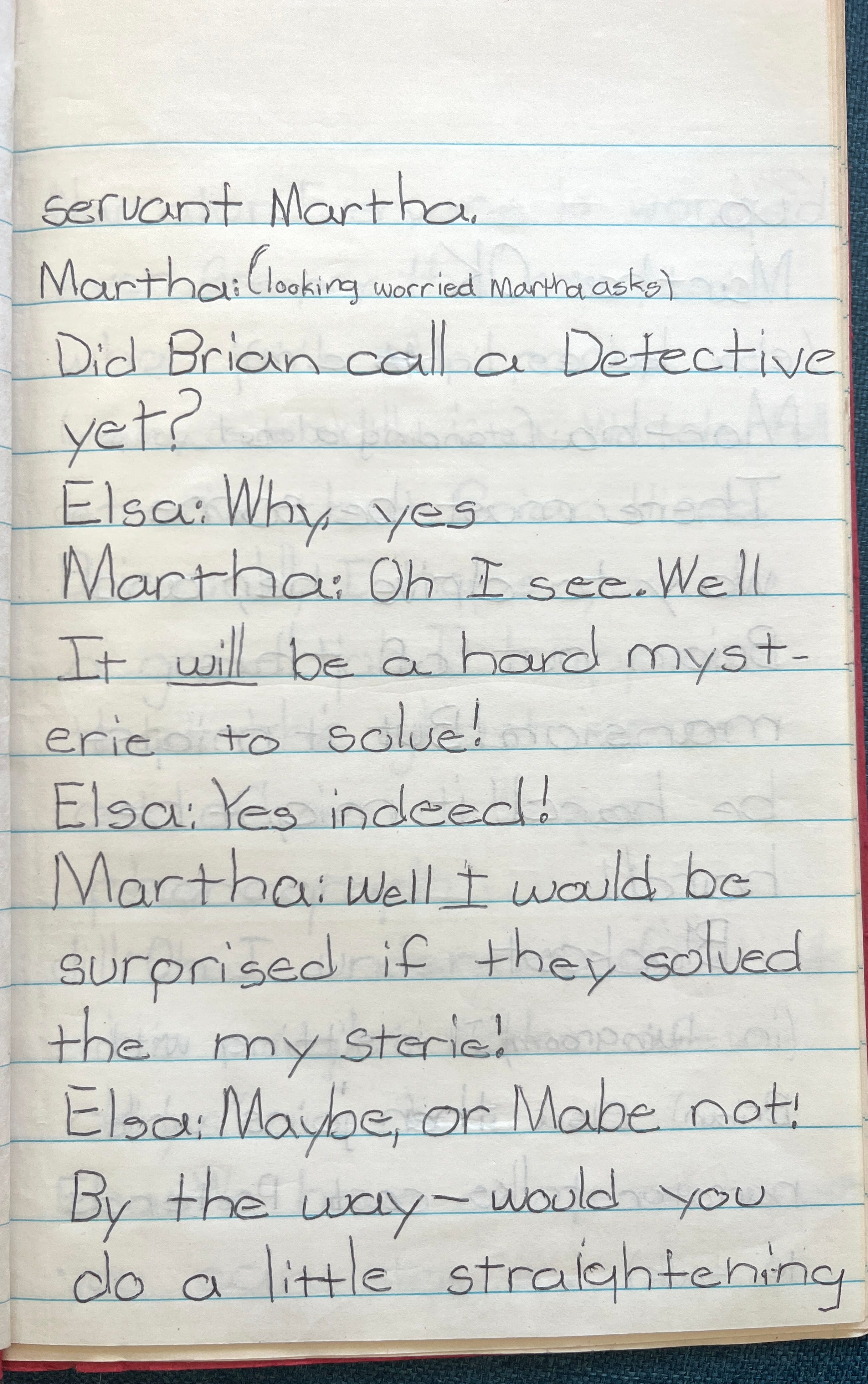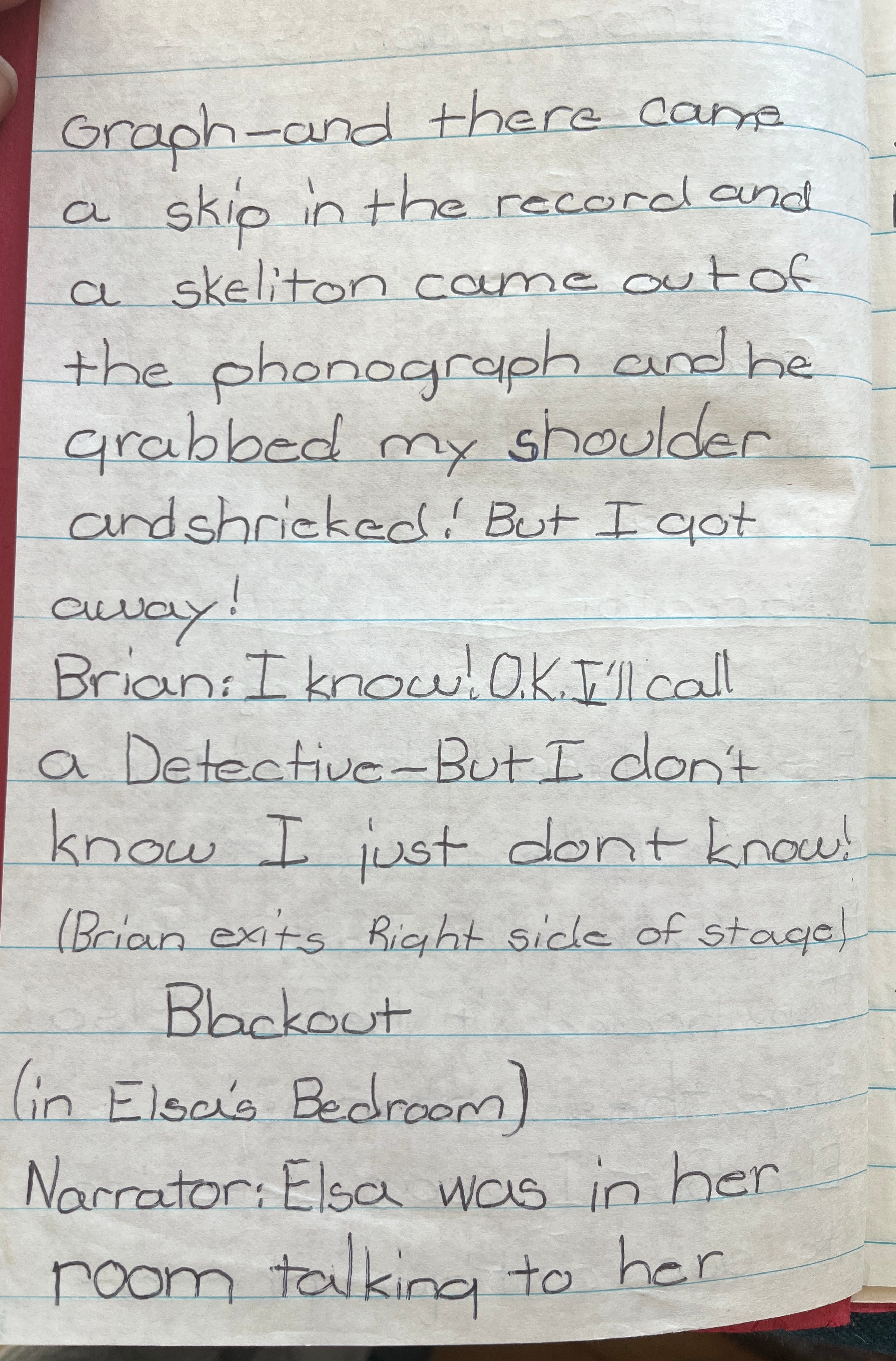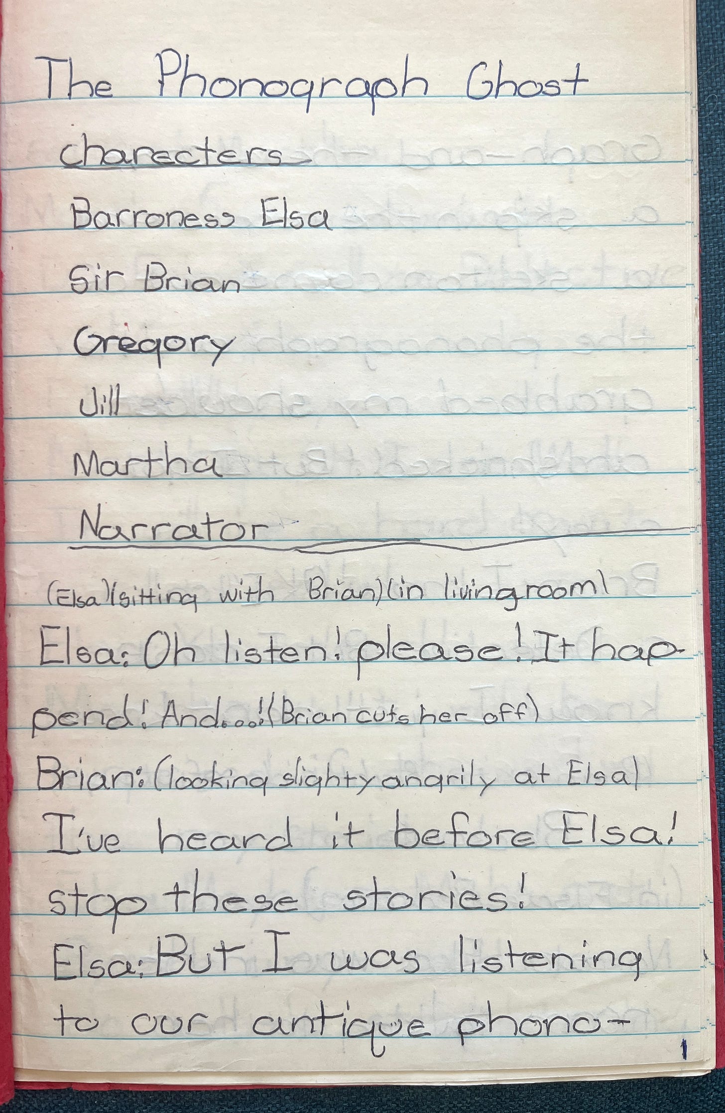 —The collection of “Mysterious Mystery Plays”—one of dozens of books I started but never completed when I was between the ages of seven and ten, written in little booklets of stapled-together paper. I got six pages into the first play, ‘The Phonograph Ghost,’ before I gave up, perhaps realizing that drama was not my medium. Here, see for yourself. (Trigger warnings: Ghosts, misspellings)