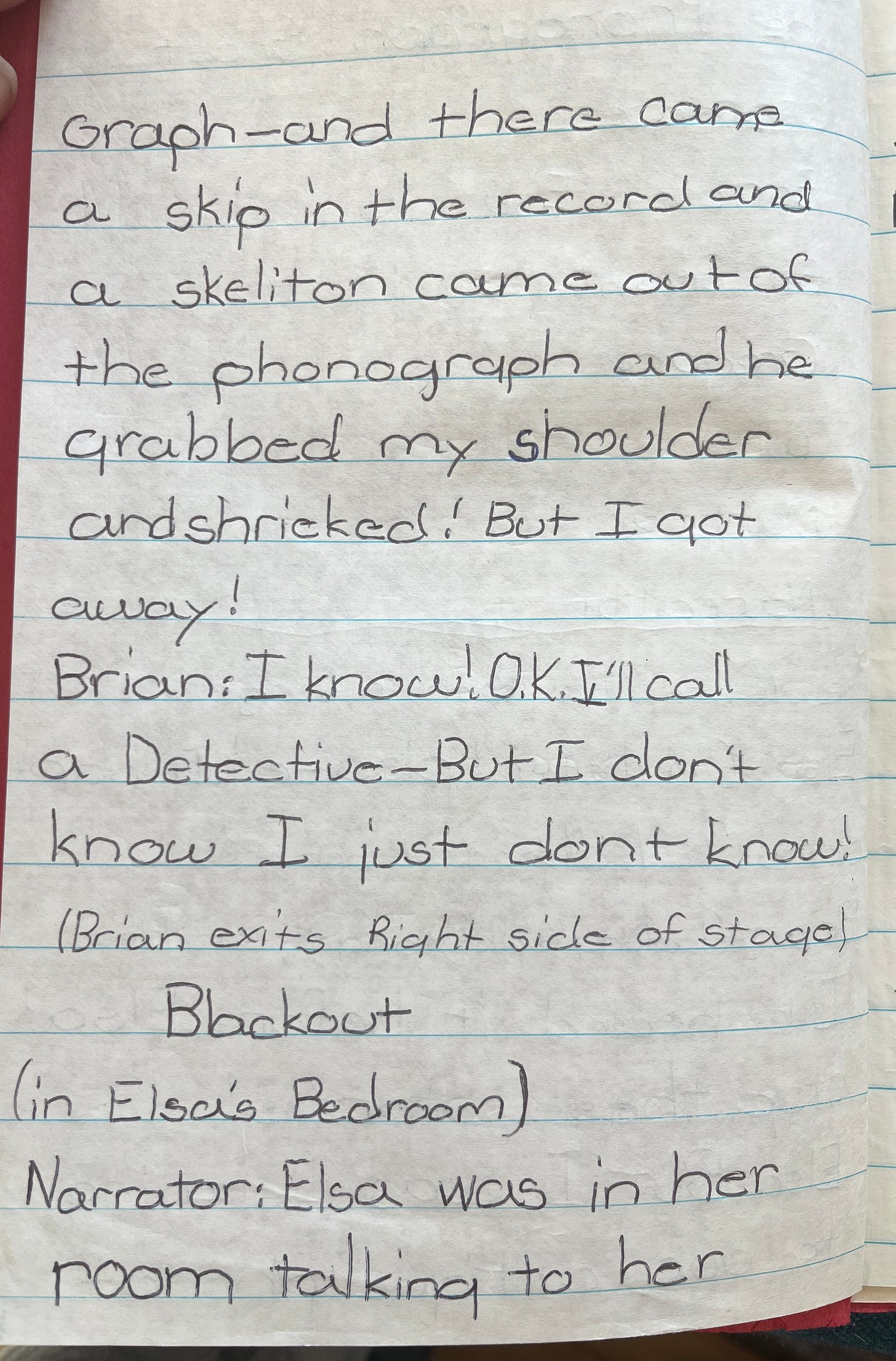 P.P. S. I agonized over whether to also share an excerpt from another childhood unfinished work, All My Fun—a Gen-X childhood horror novel about a fourth grader named Lisa who is constantly terrified that she will be kidnapped. She does, indeed, get snatched from her home (after a brief sailing trip on the Mississippi River), put into the back of a van, along with several other children. Does she escape? We will never know.